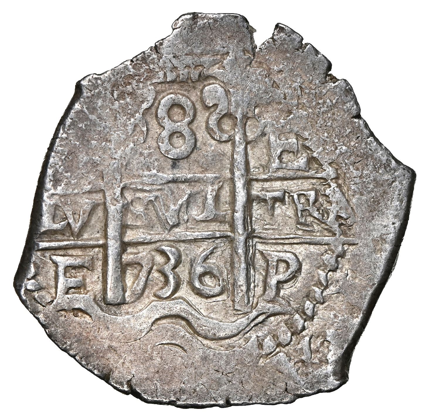 Potosi, Bolivia, cob 8 reales, 1736 E, NGC AU 58, finest known in NGC census.