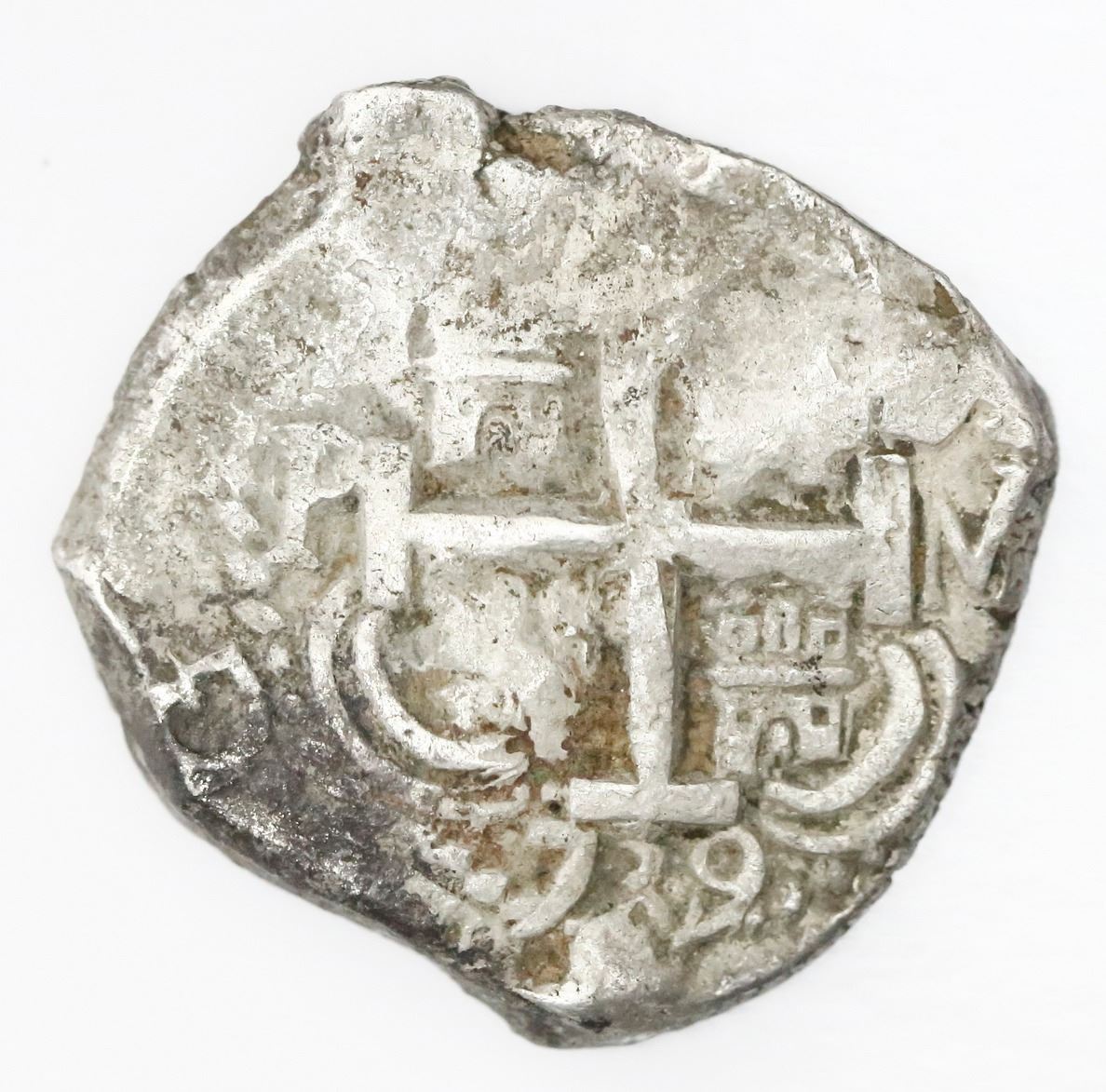 Potosi, Bolivia, cob 8 reales, 1739M. S-P47; KM-31a; CT-900. 26.45 grams. Very chunky flan with choice full cross, two dates and mintmarks, three assayers, XF with some dark encrustation.