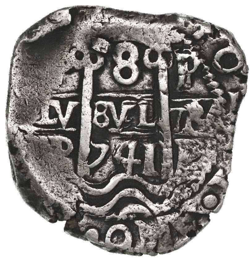 Potosi, Bolivia, cob 8 reales, 1741P. S-P48; KM-31a; Cal-1580. 26.54 grams. Very bold and 100% full pillars and cross with two dates and assayers, typically chunky and with parts of edge crude (as made), VF+ with dark toning on fields. Pedigreed to the Arturo Rosenheim collection.