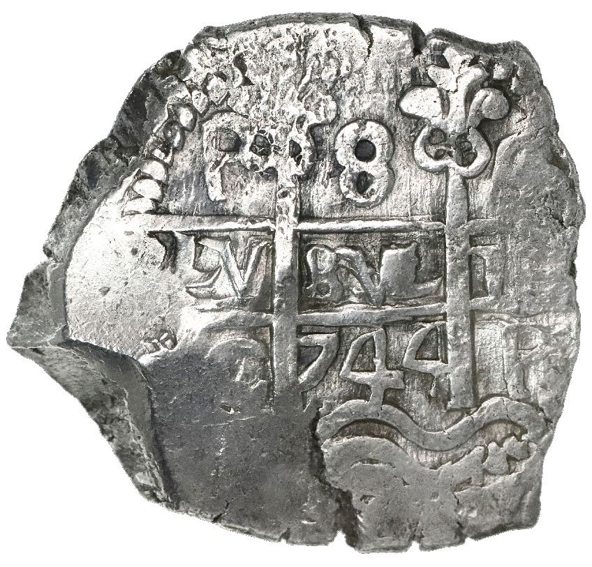 Potosi, Bolivia, cob 8 reales, 1744C. S-P49; KM-31a; Cal-1585. 27.11 grams. Chunky flan with sharp point next to blank area at bottom left of otherwise full pillars-and-waves, the cross also full and bold but slightly off-center, one-and-a-half dates and two-and-a-half mintmarks and assayers, XF+ with typical area of surface roughness near edge and natural edge-crack. Pedigreed to the Arturo Rosenheim collection.