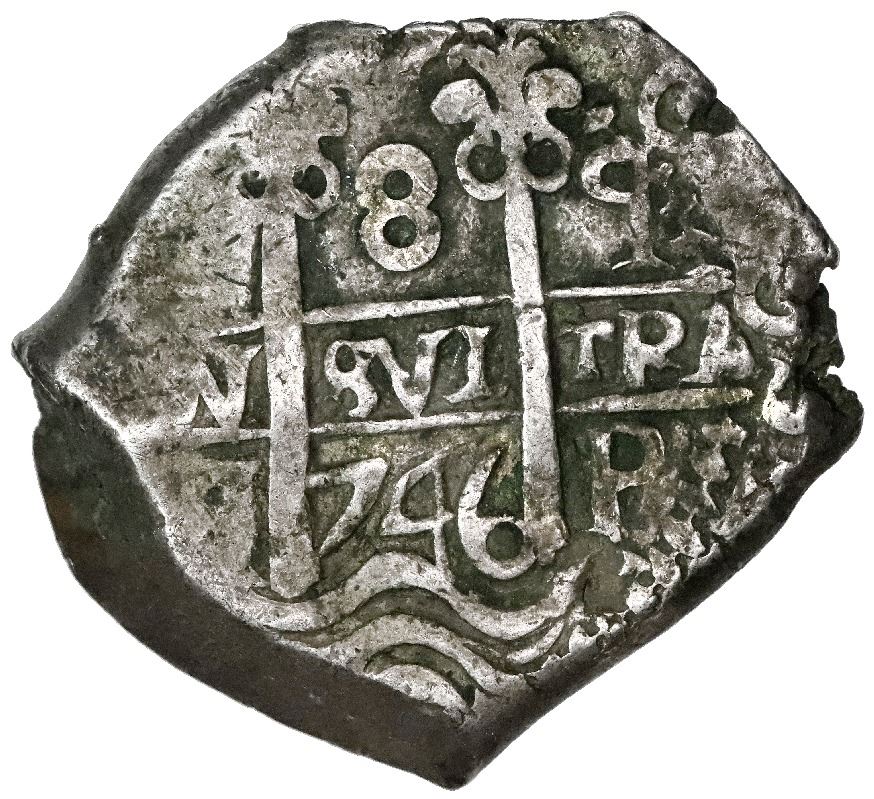 Potosi, Bolivia, cob 8 reales, 1746q. S-P50; KM-31a; Cal-1589. 26.95 grams. Bold full pillars-and-waves and cross with bold full date and half of another, two mintmarks and assayers, chunky VF with greenish encrustation all over. Pedigreed to the Arturo Rosenheim collection.