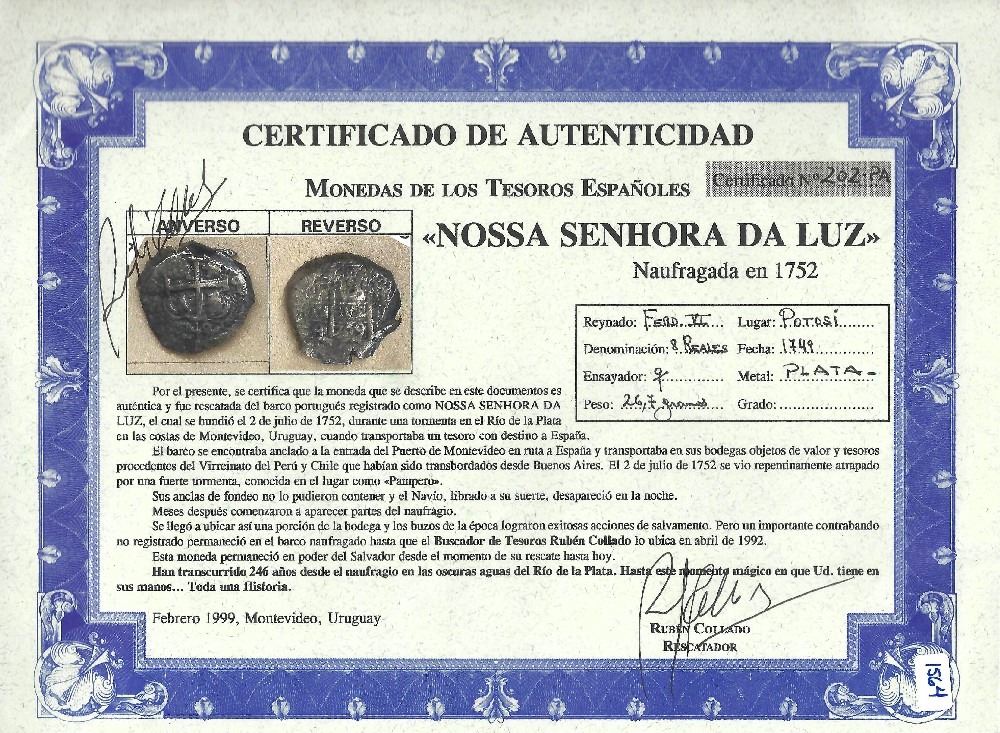 Potosi, Bolivia, cob 8 reales, 1749q. S-P50a; KM-40; Cal-511. 26.60 grams. Choice cob from this wreck with faint surface corrosion, bold and full pillars and cross, two complete dates visible, natural edge crack, spots of dark coloration. With original 1999 photo-certificate from the salvor (Collado). From: Luz, sunk in 1752 off Montevideo, Uruguay