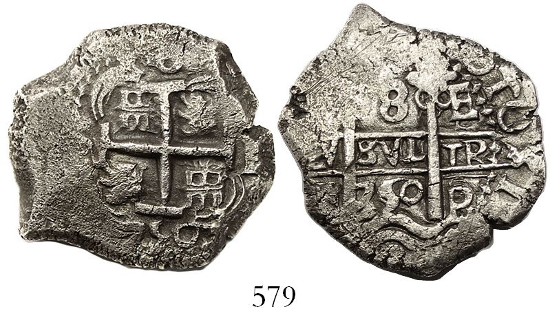 Potosi, Bolivia, cob 8 reales, 1750E. S-P51; KM-40 ;CT-361. 25.88 grams. Choice full cross with date below, full but off-center pillars with second date, bold assayer and mintmark, (P)OTOSI in legend, nicely toned, no corrosion. With 1999 photo-certificate #310-P from the salvager (Collado), and pedigreed to our Auction #4, with original lot-tag #572. Recovered from: Luz, sunk in 1752 off Montevideo, Uruguay