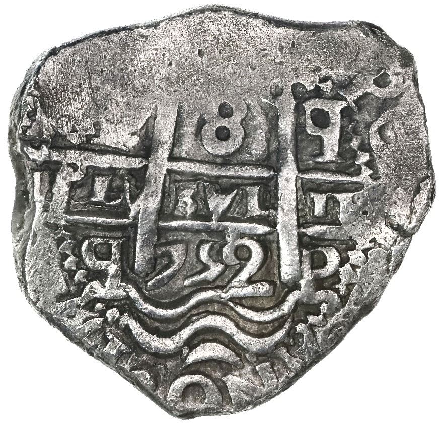 Potosi, Bolivia, cob 8 reales, 1752q. S-P52; KM-40; Cal-522. 27.08 grams. Exceptionally bold full pillars-and-waves and cross-lions-castles, all three dates and assayers, lightly toned AXF, odd-shaped flan. Pedigreed to the Arturo Rosenheim collection.
