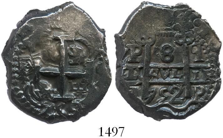 Potosi, Bolivia, cob 8 reales, 1752q. S-P52; KM-40; CT-364. 27.3 grams. Very high grade for era (near AU) and deeply toned, with very bold full cross, full pillars, 2 dates, 3 assayers and mintmarks.
