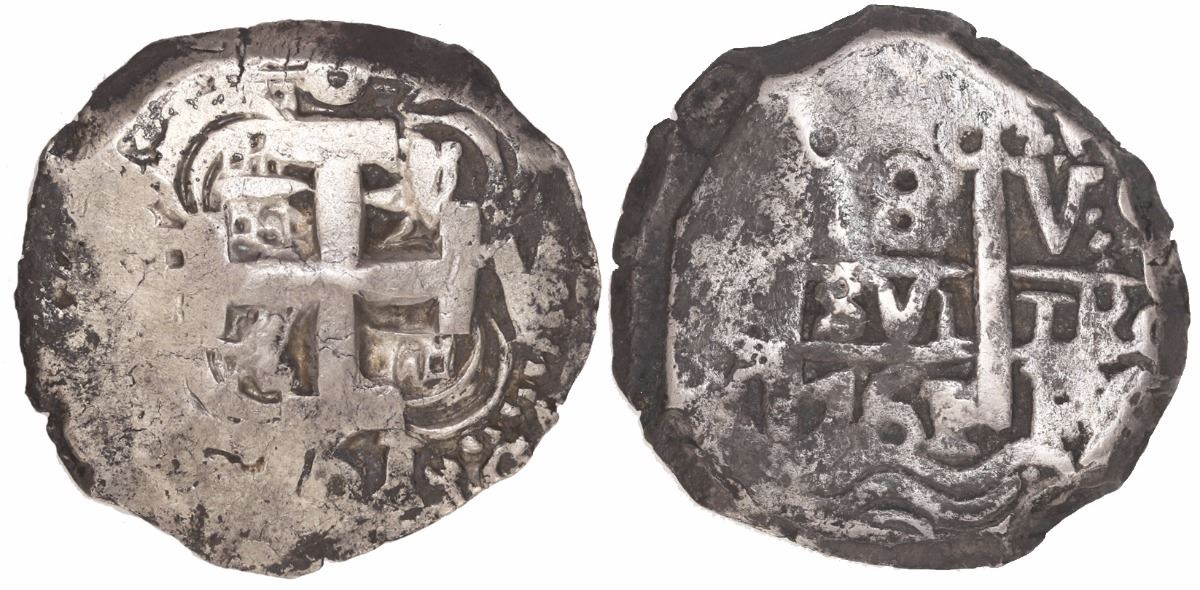 Potosi, Bolivia, cob 8 reales, 1761V-Y-V. 26.97 grams. Chunky but round, with somewhat flat strike for the era yet with two clear dates and two bold assayers, AVF with patchy toning. From the Marco Gardini collection of Potosi cob 8 reales.