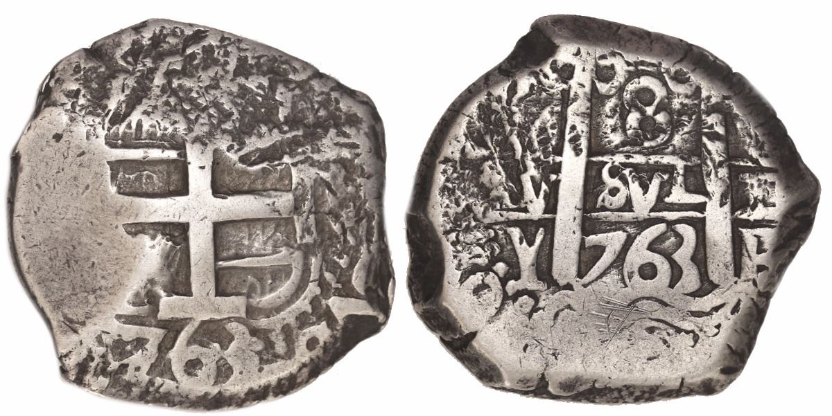Potosi, Bolivia, cob 8 reales, 1763V-Y-V. 26.86 grams. Full pillars and bold cross with three dates (rare thus), AVF with nice contrast, rough surfaces on opposing sides (as made).