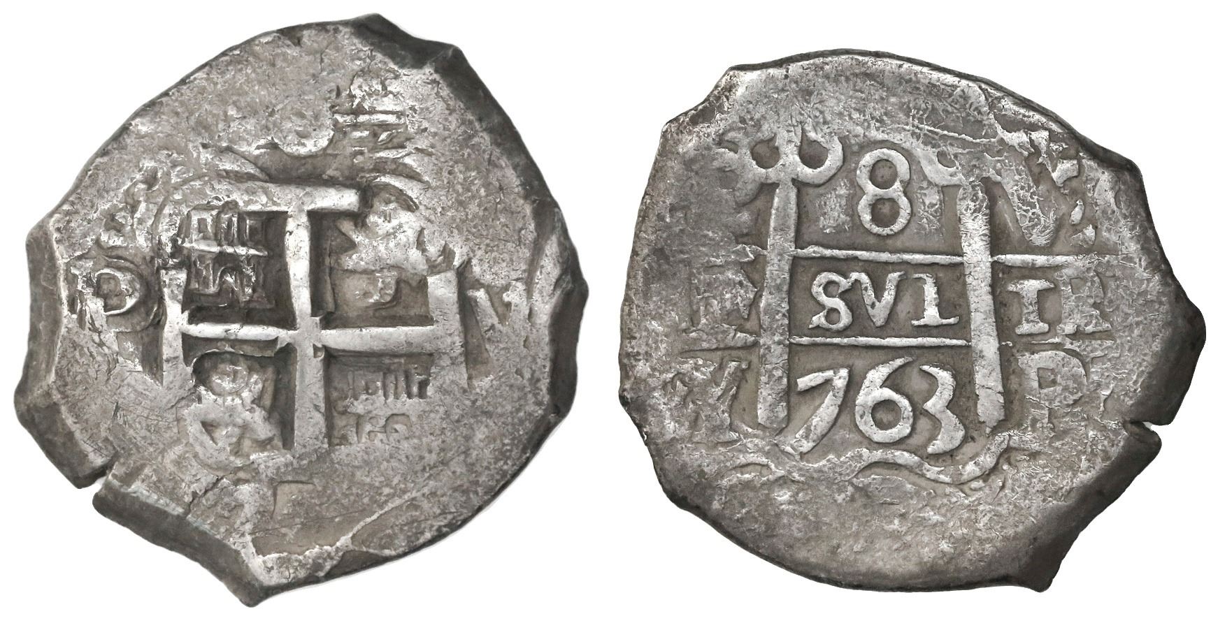 Potosi, Bolivia, cob 8 reales, 1763V-Y-V.