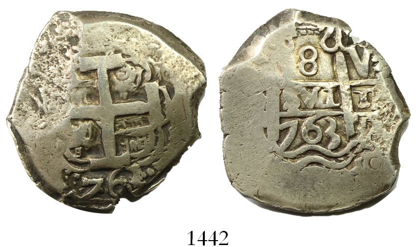 Potosi, Bolivia, cob 8 reales, 1763V-(Y). S-P57; KM-45 ;CT-950. 27.09 grams. Nice for era, with 2 bold dates and bold assayer V, nearly full cross, VF with lightly toned fields.