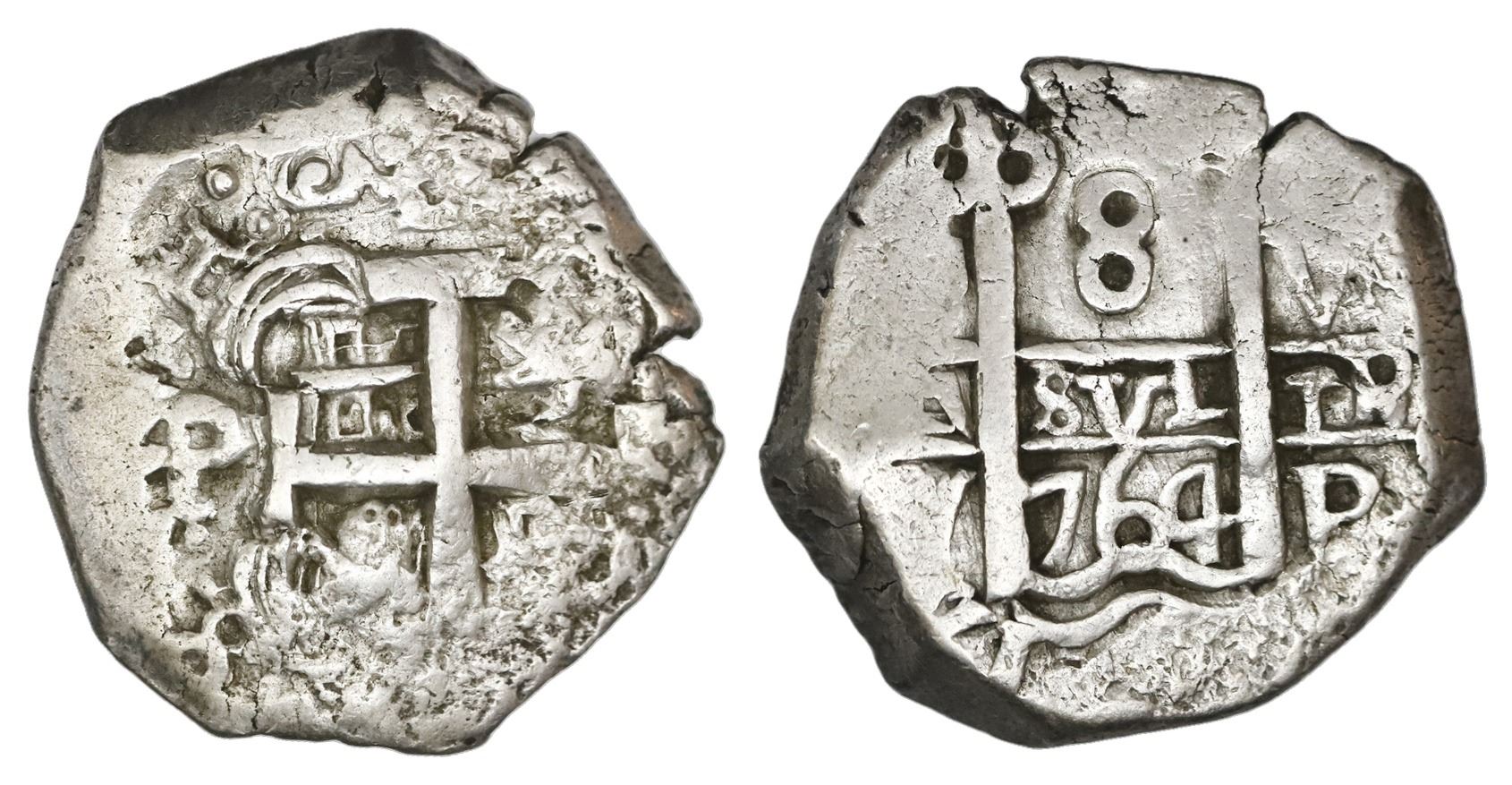 Potosi, Bolivia, cob 8 reales, 1764V-Y. S-P57; KM-45; Cal-1140. 26.76 grams. Nice round flan (albeit chunky) with bold full pillars, bold but off-center cross, AXF with mysterious surface roughness on opposing sides per the period.