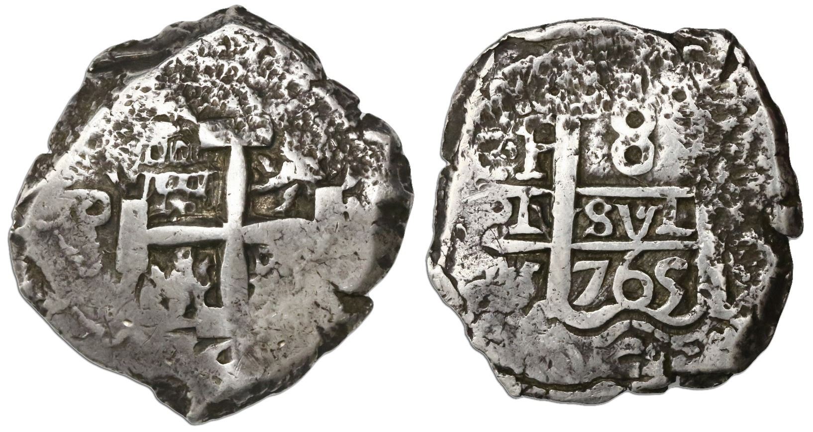 Potosi, Bolivia, cob 8 reales, 1765(V)-Y. S-P57; KM-45; CT-952. 26.89 grams. Bold date, nearly full pillars and cross, nicely toned AVF but typically chunky and with opposing areas of surface porosity (as made).