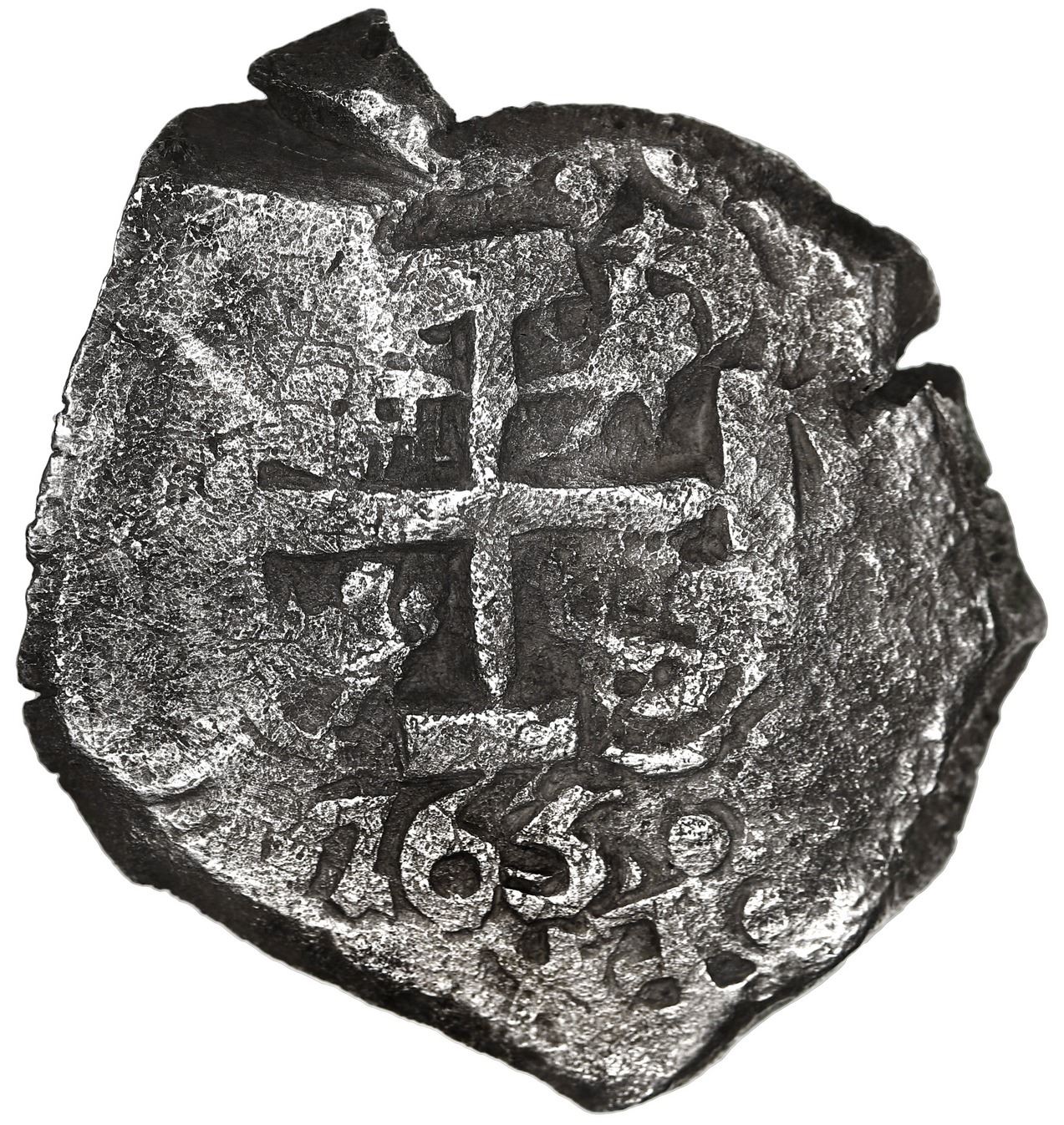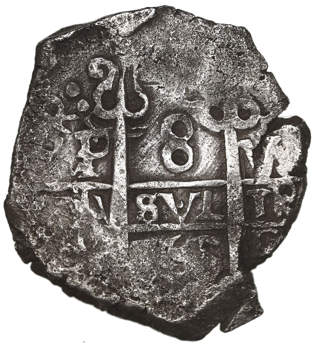 Potosi, Bolivia, cob 8 reales, 1765 V-Y. S-P57; KM-45; Cal-1141. 25.35 grams. Chunky flan with parts of edge crude (including two cracks, one small overcut and even a spot of folded-over metal), but with good full cross above very bold full date, full pillars (choice top of left pillar), XF or better with slight surface porosity and faint toning. Pedigreed to the Ponterio auction of February 1998, with original lot-tag 798.