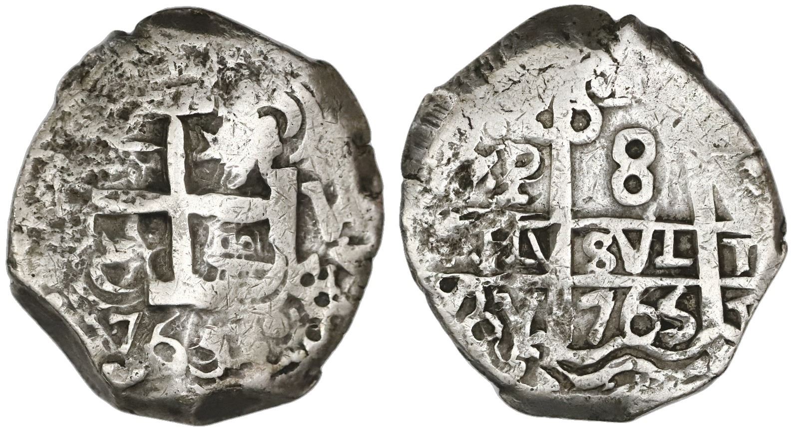 Potosi, Bolivia, cob 8 reales, 1765Y-Y-V. S-P57; KM-45; Cal-1141. 26.76 grams. three dates and assayers (rare thus) on a chunky but roundish flan with good full cross and nearly full pillars, VF with surface roughness on opposing sides.