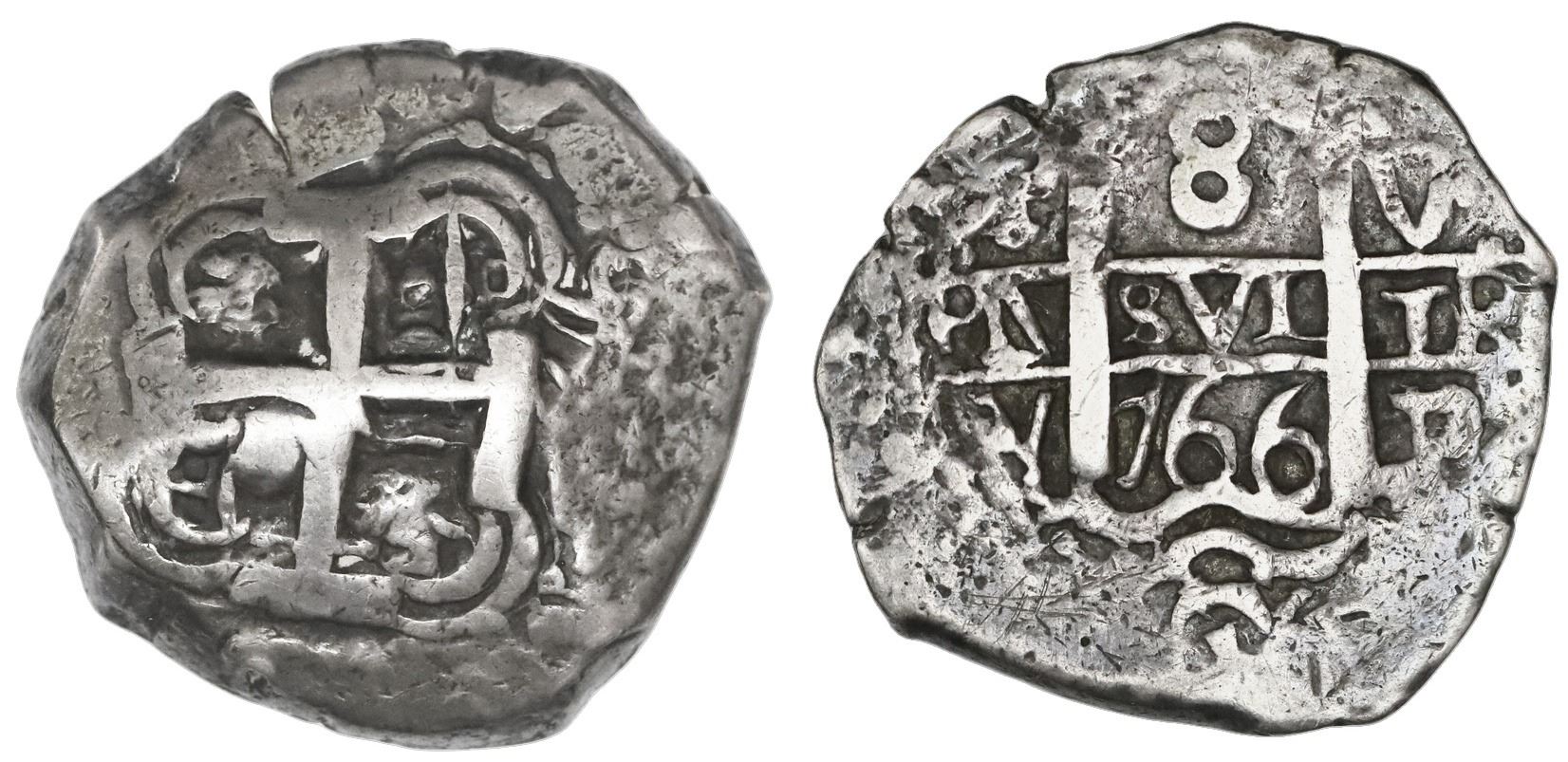 Potosi, Bolivia, cob 8 reales, 1766V-Y. S-P57; KM-45; Cal-1142. 26.88 grams. Round but chunky flan with good full pillars, nearly full cross, two dates and assayers, attractively toned VF.