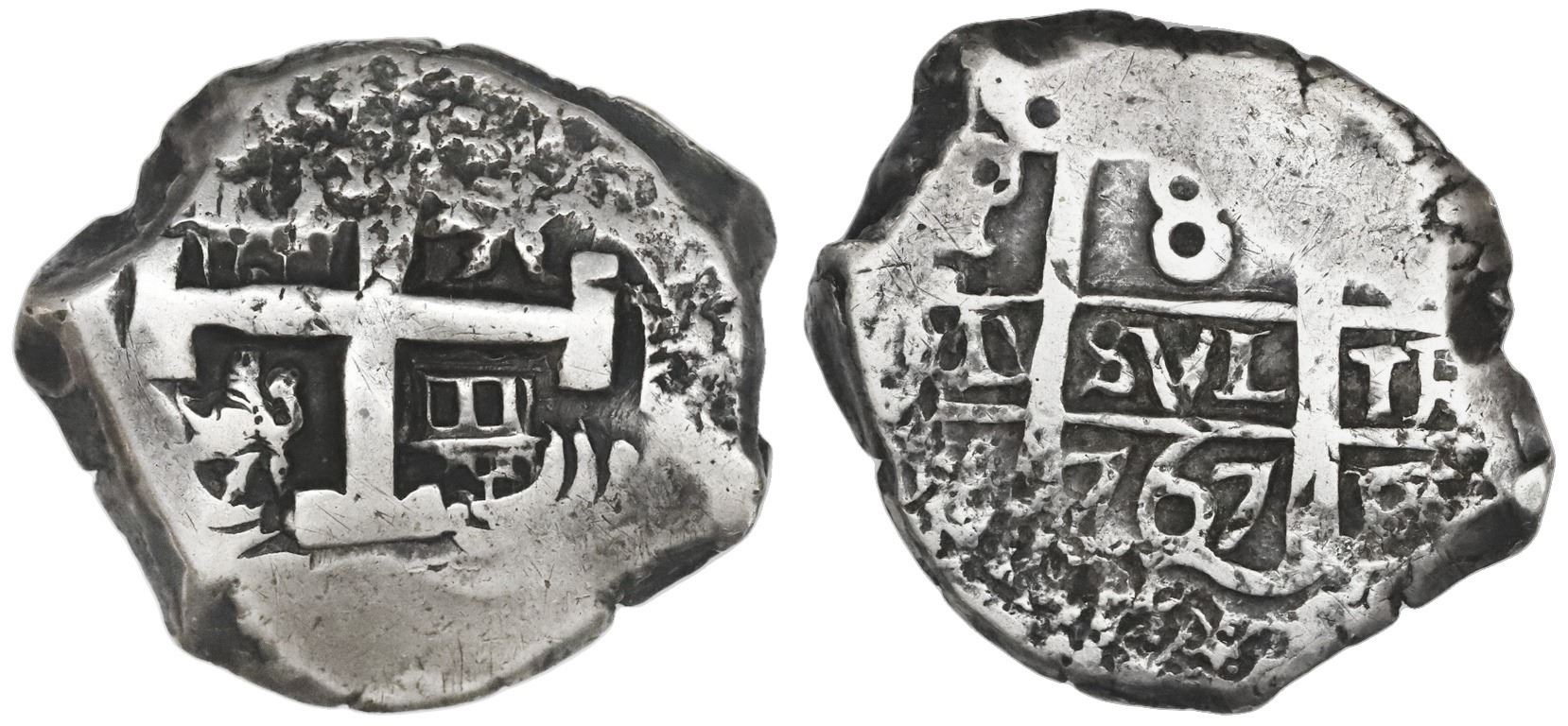 Potosi, Bolivia, cob 8 reales, 1767(V-Y). S-P57; KM-45; Cal-1143. 26.86 grams. Bold cross and pillars on a typically chunky flan with clear date, deep toning, VF with surface roughness on opposing sides.