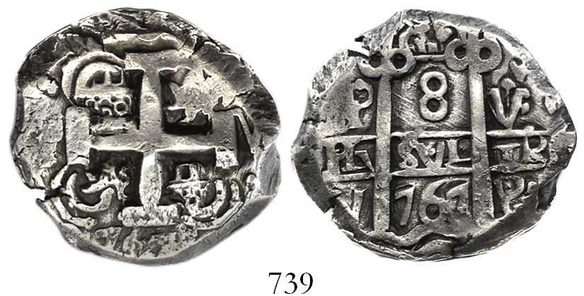 Potosi, Bolivia, cob 8 reales, 1767V-Y. S-P57; KM-45 ;CT-954. 27.07 grams. Choice specimen, still chunky per the type but with full and bold and well-centered pillars and cross, two dates, three assayers, VF with contrasting toning, small edge-split.