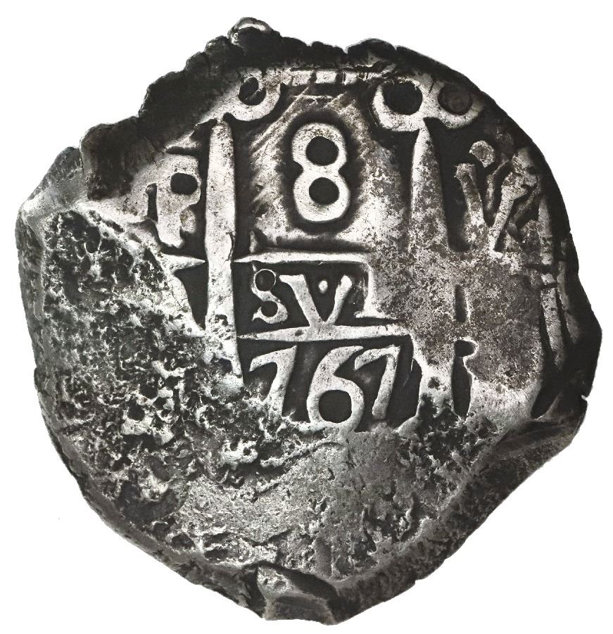 Potosi, Bolivia, cob 8 reales, 1767V-(Y). S-P57; KM-45; Cal-1143. 26.95 grams. Roundish chunky flan with very bold denomination and date within pillars, incomplete cross with strange lettering below that looks like a combination of the first 7 of the date with the end of the king's ordinal (TERTI)VS, toned AVF. Pedigreed to the Arturo Rosenheim collection.
