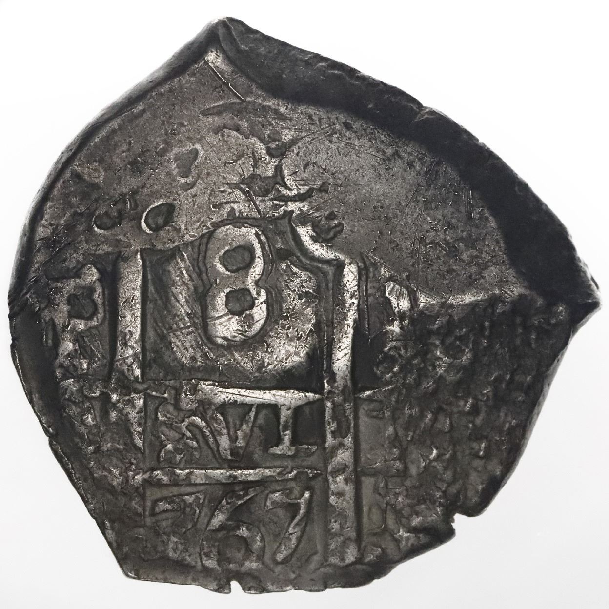 Potosi, Bolivia, cob 8 reales, 1767V-(Y). S-P57; KM-45; Cal-1143. 26.37 grams. Thick XF piece, a bit crudely struck and with a few scratches on flat areas, two visible dates, some original luster in crevices.