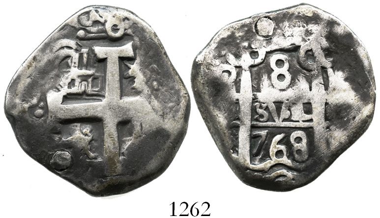 Potosi, Bolivia, cob 8 reales, 1768(V-Y). S-P57; KM-45; CT-955. 25.8 grams. Bold full pillars and date, nearly full cross, but somewhat low grade (VG) and crude, with spotty toning and plugged hole at edge.