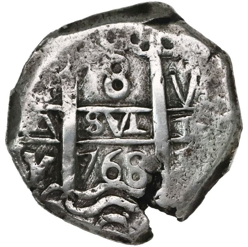 Potosi, Bolivia, cob 8 reales, 1768V-Y. S-P57; KM-45; Cal-1145. 27.00 grams. Bold full cross with particularly nice lions, full pillars-and-waves with bold full date and both assayers (rare to see both the V and Y so distinct), toned in crevices, chunky-flan VF+ with edge-crack. Pedigreed to the Arturo Rosenheim collection.