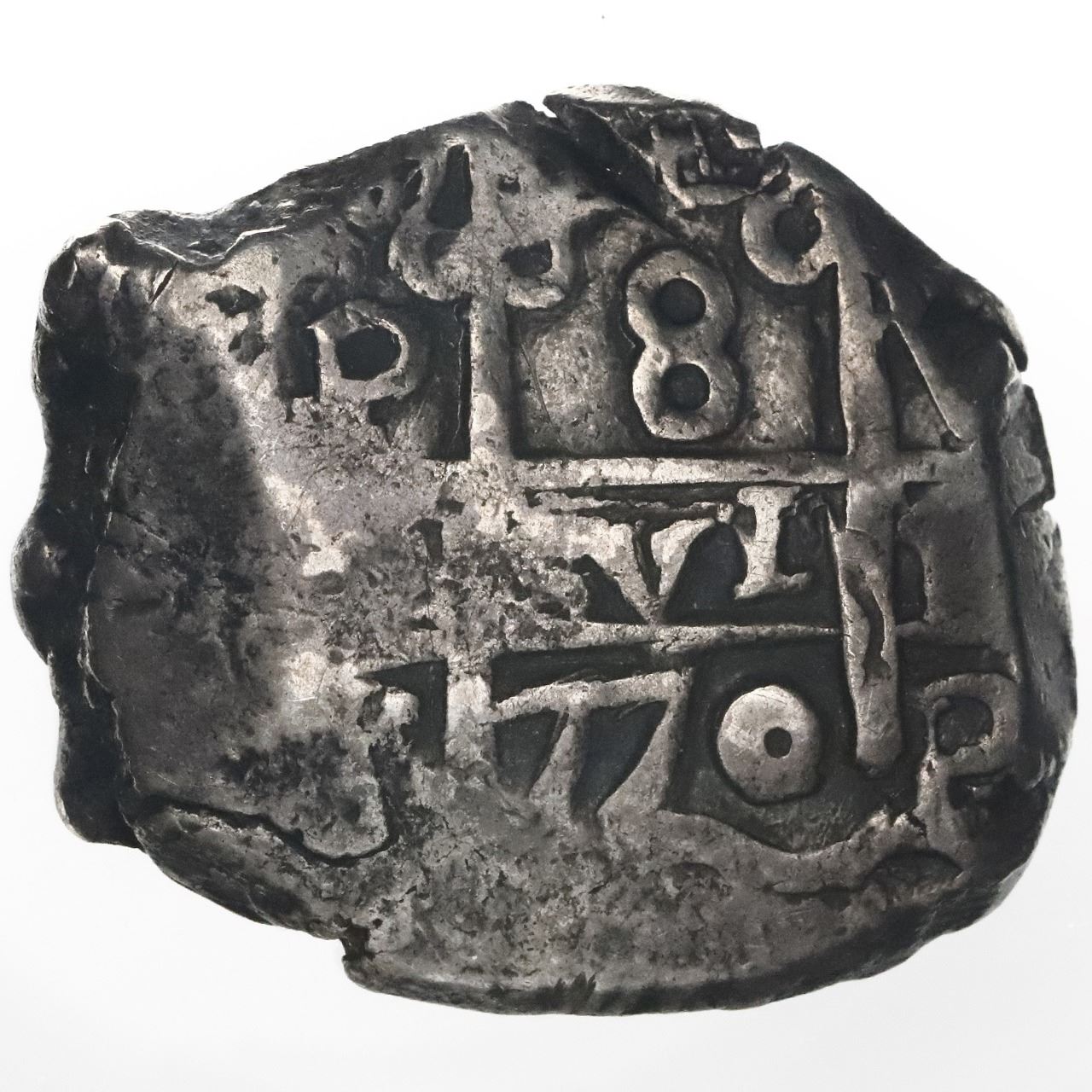 Potosi, Bolivia, cob 8 reales, 1770V-(J?). KM-45. 26.97 grams. VF with minor surface marks, two dates visible (one particularly bold), partial pillars and cross, dark gray toning, partially visible bottom-left assayer that does not look like Y but not enough to be certain it is J (which is rare).