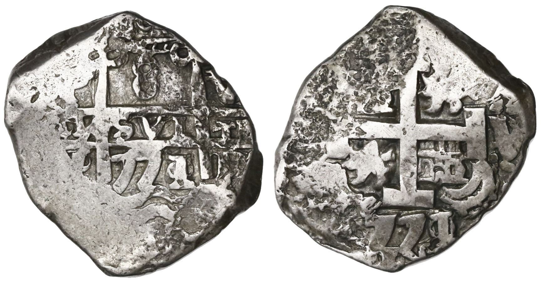 Potosi, Bolivia, cob 8 reales, 1771/0V-Y with Y/P at bottom left, rare. S-P59; KM-45; CT-961. 26.93 grams. Crude surfaces but with two bold dates showing clear 1/0, all three assayers with curious Y/P at bottom left, toned Fine+ with flat areas.