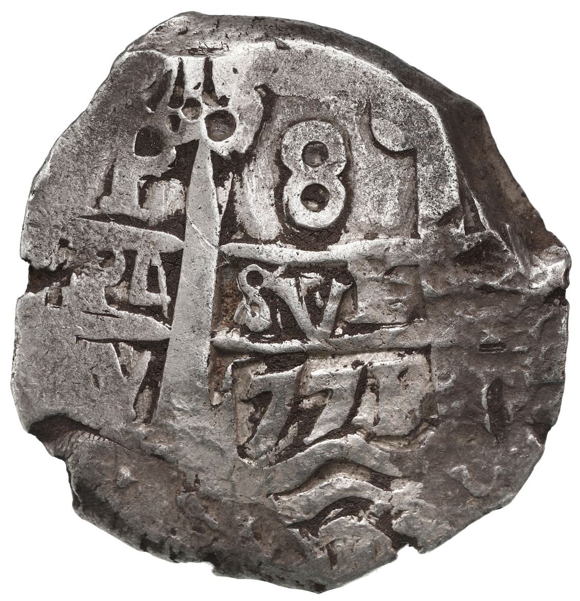 Potosi, Bolivia, cob 8 reales, 1771 V-Y. S-P59; KM-45; Cal-1154. Chunky VF+ with some dark sediment in crevices, one full pillar and nearly full cross.