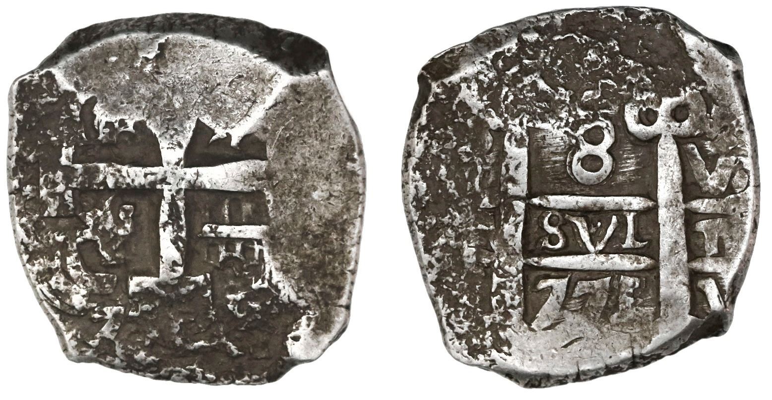 Potosi, Bolivia, cob 8 reales, 1771V-(Y), assayer V at upper right and bottom right (rare). S-P57. 26.45 grams. Smallish (chunky) flan with one pillar full and bold, full V at top right and clear top-left portion of misplaced V at bottom right, brown-toned VF with curious roughness on opposing sides.
