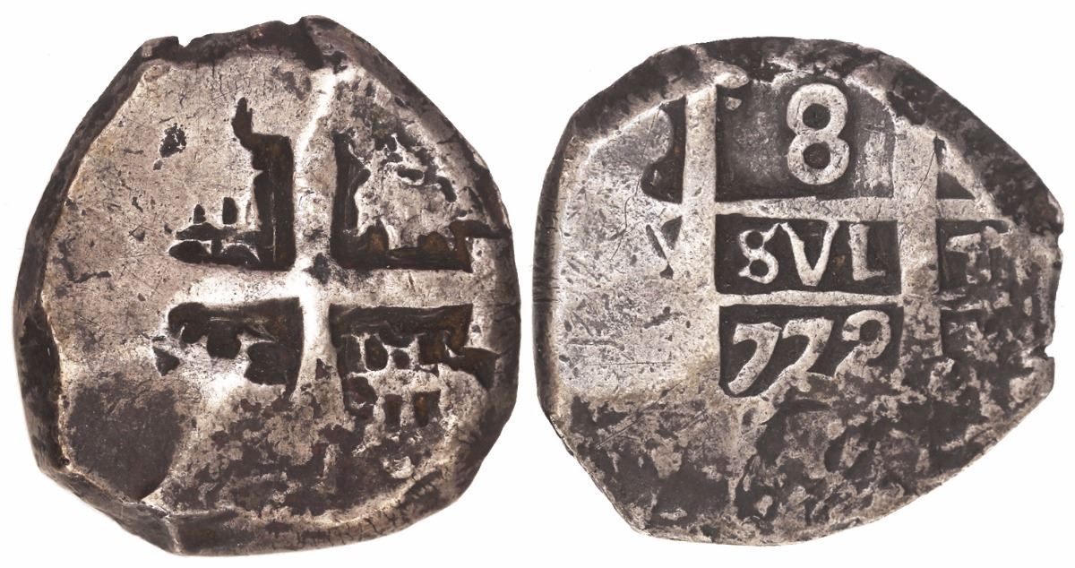 Potosi, Bolivia, cob 8 reales, 1772(V-Y) 26.84 grams. Bold full cross, most of pillars with bold denomination and date on that side, deeply toned Fine+ with surface roughness on pillars side only. From the Marco Gardini collection of Potosi cob 8 reales.