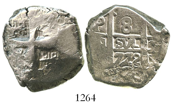 Potosi, Bolivia, cob 8 reales, 1772V-(Y). S-P59; KM-45; CT-963. 26.9 grams. Small, thick and chunky flan with incomplete details but clear date, non-toned Fine.