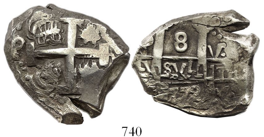 Potosi, Bolivia, cob 8 reales, 1772V-(Y). S-P57; KM-45 ;CT-963. 27.07 grams. Very unusual shape with deep slit in edge, choice full cross, doubled pillars, nicely toned VF, aligned axes (coin alignment).