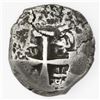 Potosi, Bolivia, cob 8 reales, 1772V-(Y). S-P59; KM-45; Cal-1156. 26.84 grams. Round and chunky but with nice surfaces, bold date and assayer, very bold but off-center cross, AVF with toned fields.