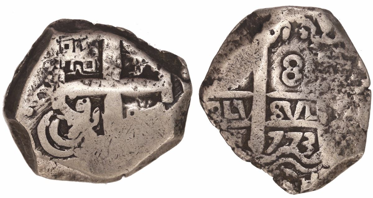 Potosi, Bolivia, cob 8 reales, 1773(V-Y), rare. 26.19 grams. One of the best specimens we have seen of this popular final year of cobs, with complete date above full waves, most of cross on other side, well centered on a typically chunky flan, Fine+ with contrastingly dark toning around details.