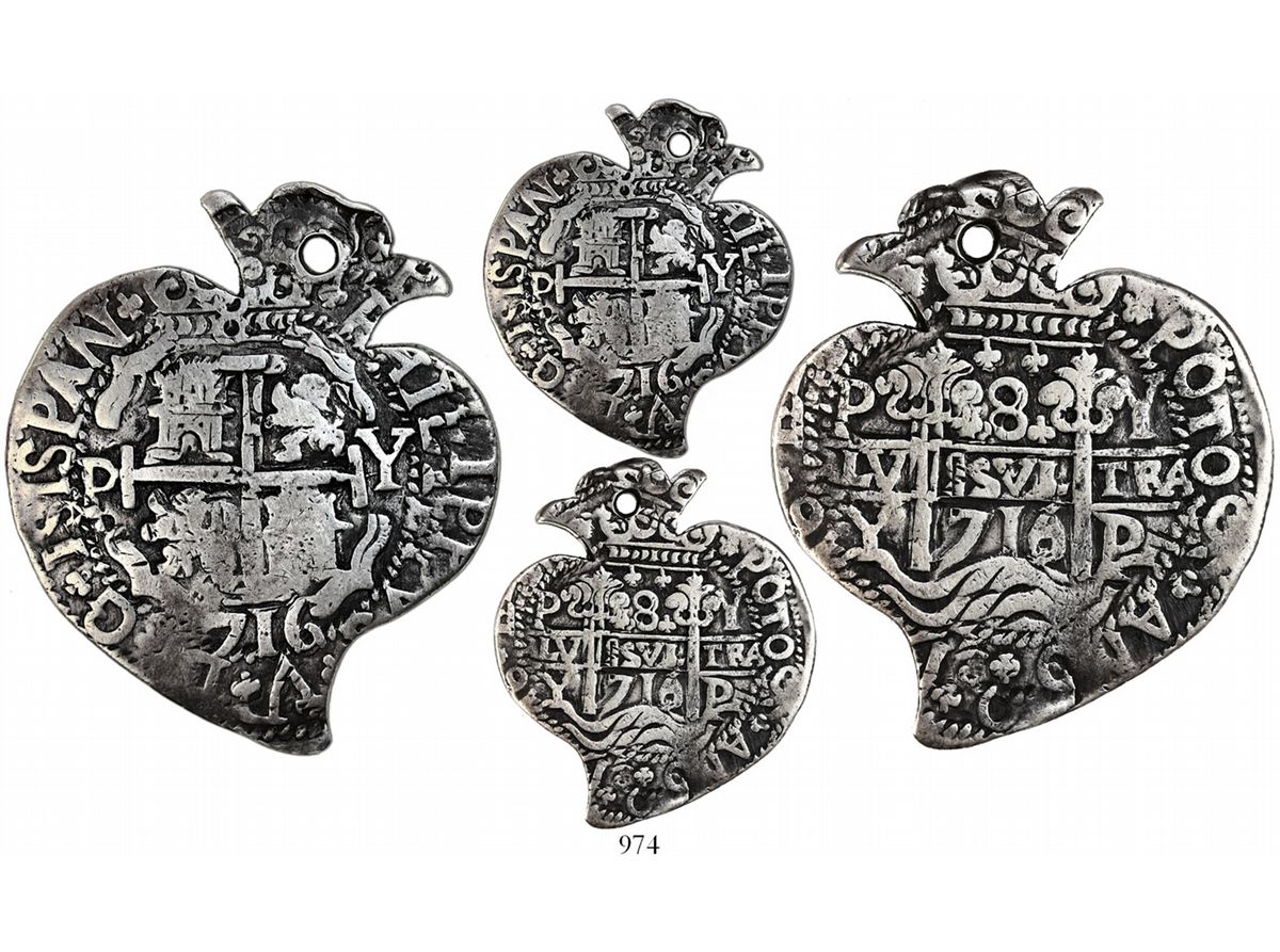 Potosi, Bolivia, cob 8 reales Heart, 1716Y, very rare. S-P43aCT-854. 26.56 grams. The Hearts of Potosi, made to look like the Catholic burning "sacred heart" of Christ (see http://www.sedwickcoins.com/articles/hearts.htm), are eye-catchingly beautiful, revered even in their own time as lasting symbols of unique rarity, none more so than the massive 8 reales. Seldom do these magnificent 8R come up for sale--just lucky that we had one in our last auction--and when they do they see spirited bidding. The present specimen is a nice AVF, with minimal doubling, no tooling or gilding, and elegantly aligned axes, nicely toned fields and unmistakable shape with inevitable hole in the "flames" at top. Nearly full legends include a partial third date and king's ordinal V. Curiously, four pomegranates surround the denomination on the pillars side.