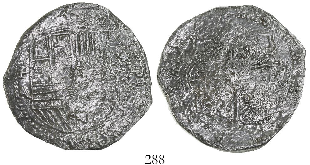 Potosi, Bolivia, cob 8 reales, Philip II, assayer A, Grade 1. S-P11; KM-5.1; CT-157. 24.21 grams. Bold full P-A, full shield and crown, but with moderate surface corrosion that makes the cross almost not visible. With Fisher certificate #231518. Recovered from: Atocha, sunk in 1622 west of Key West, Florida