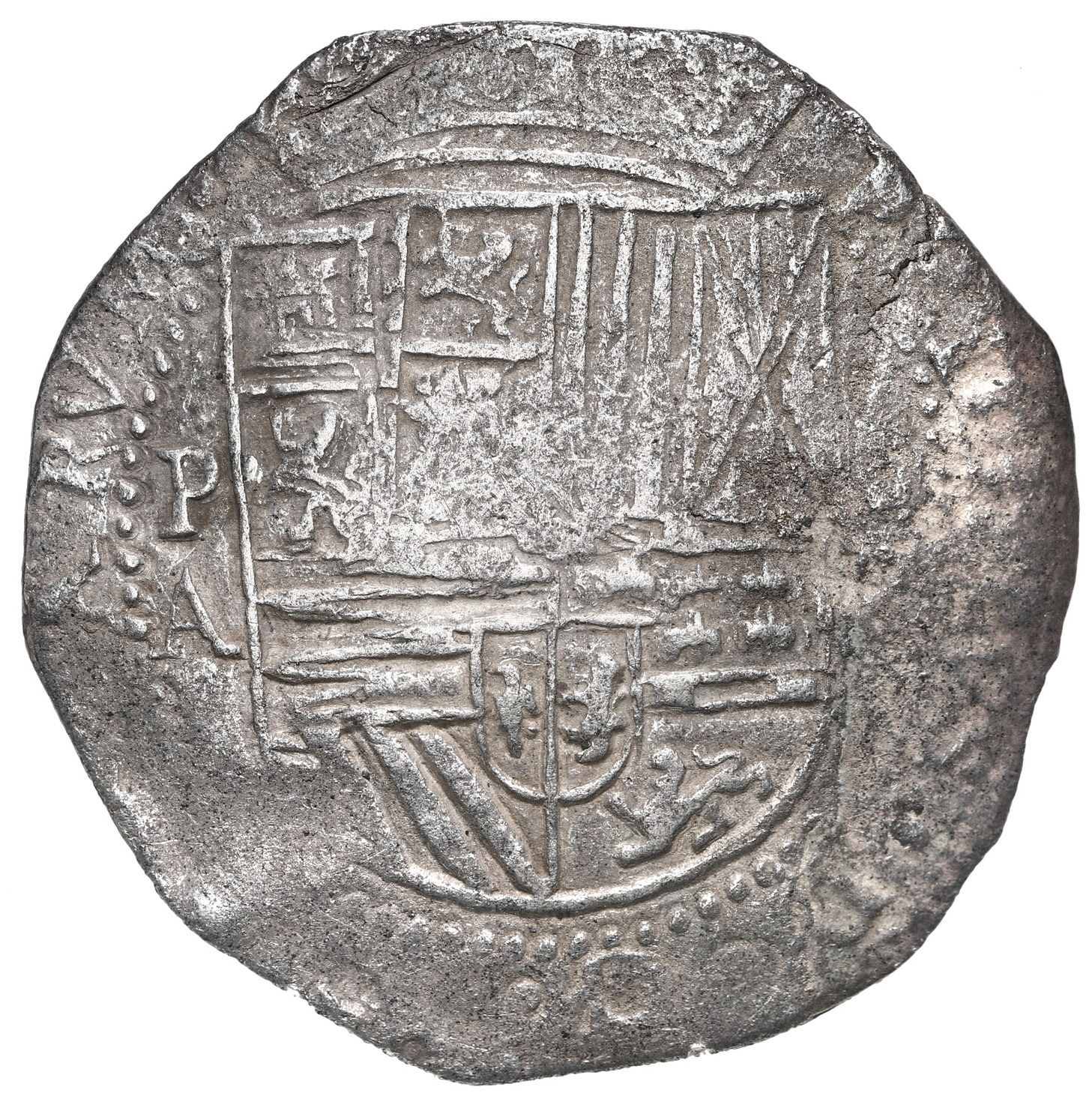 Potosi, Bolivia, cob 8 reales, Philip II, assayer A, Grade 2.