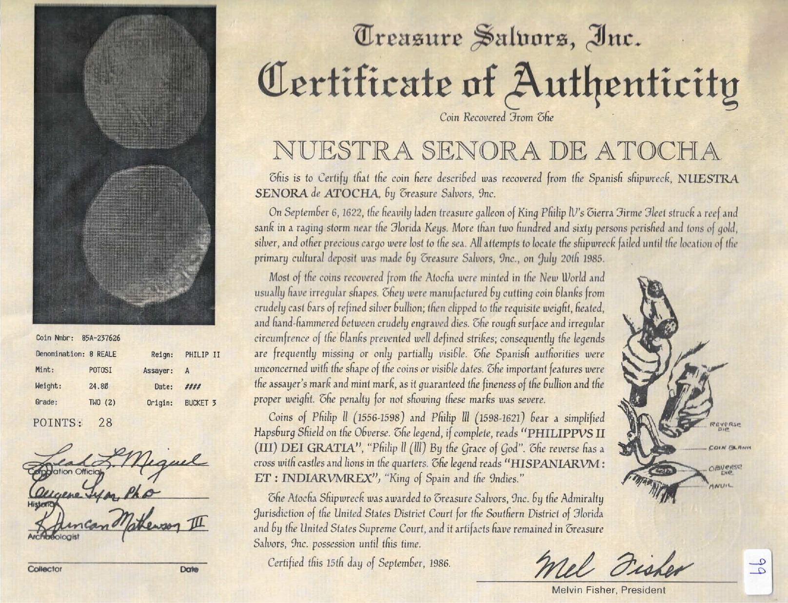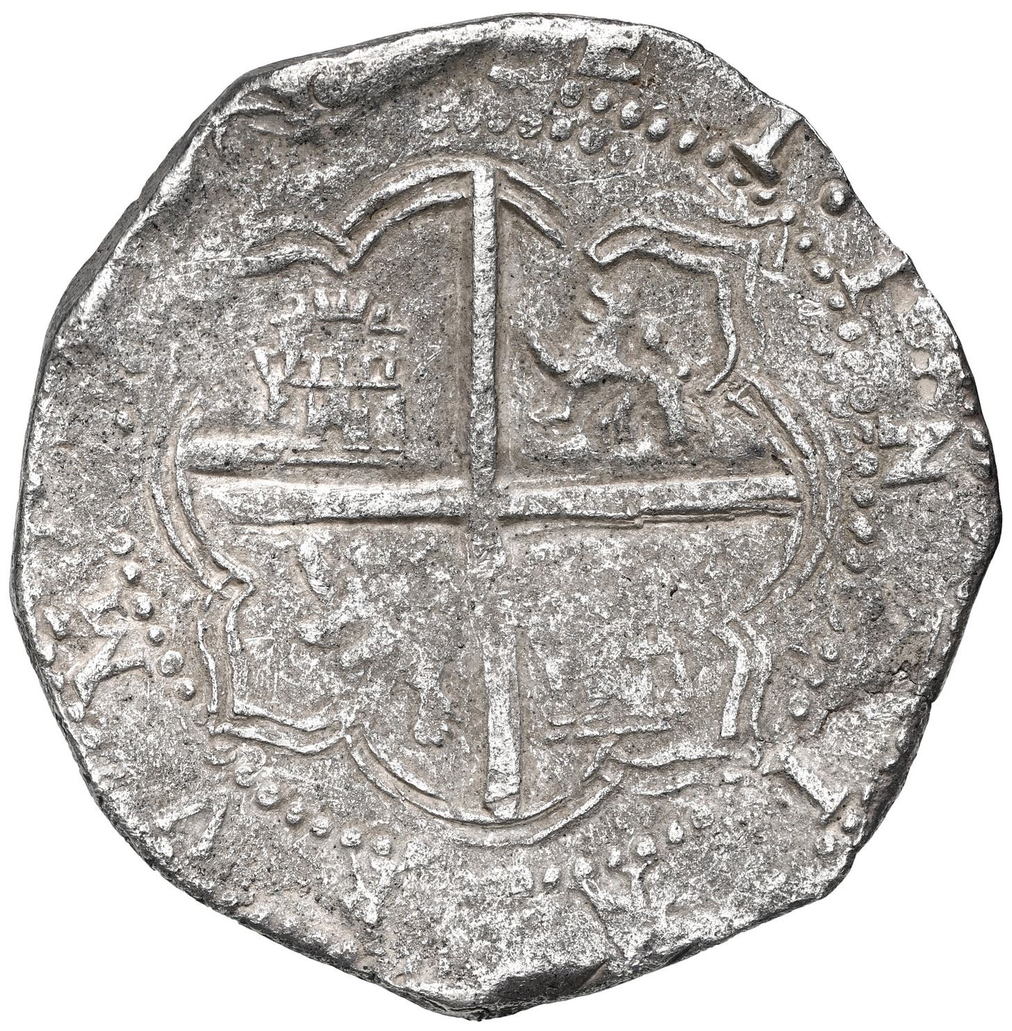 Potosi, Bolivia, cob 8 reales, Philip II, assayer A, Grade 2. S-P11; KM-5.1; Cal-674. 24.98 grams. Very broad flan with full details including crown and most of legend, minor surface corrosion and lightly toned, just very low in contrast, better early assayer. With Fisher tag and photo-certificate 85A-148826. From: Atocha, sunk in 1622 west of Key West, Florida