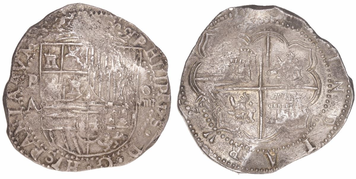 Potosi, Bolivia, cob 8 reales, Philip II, assayer A, denomination as "o-VIIII".