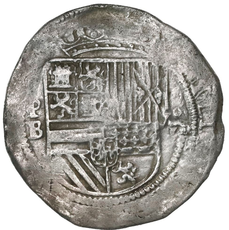 Potosi, Bolivia, cob 8 reales, Philip II, assayer B (1st period), rare. S-P4; KM-5.1; Cal-672. 27.02 grams. XF+ with finely detailed full shield (slightly doubled on right side) and cross, clear P-B and denomination o-VIII, broad and round flan with regrettably flat peripheries but still fully matchable with Sellschopp #147 (which is much smaller in size), no toning.