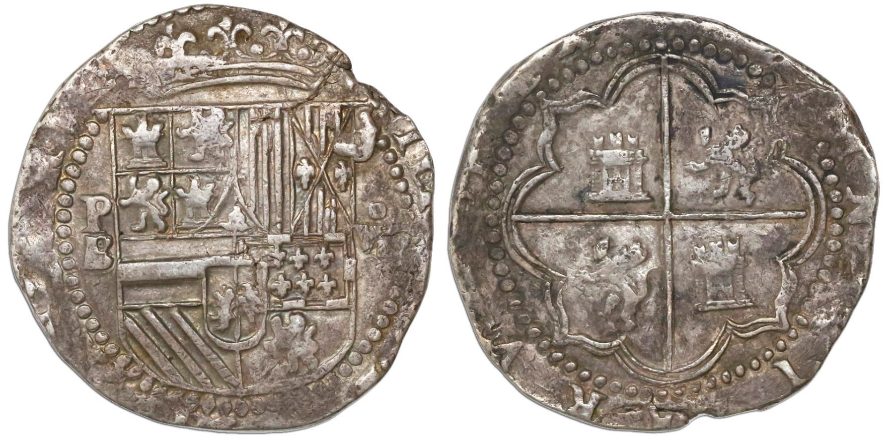 Potosi, Bolivia, cob 8 reales, Philip II, assayer B (2nd period). S-P6; KM-5.1. 27.09 grams Richly old-toned XF (low contrast) with choice full shield and crown and cross-and-tressure, notable variety with old "Seville" lions (as opposed to rampant) on reverse.