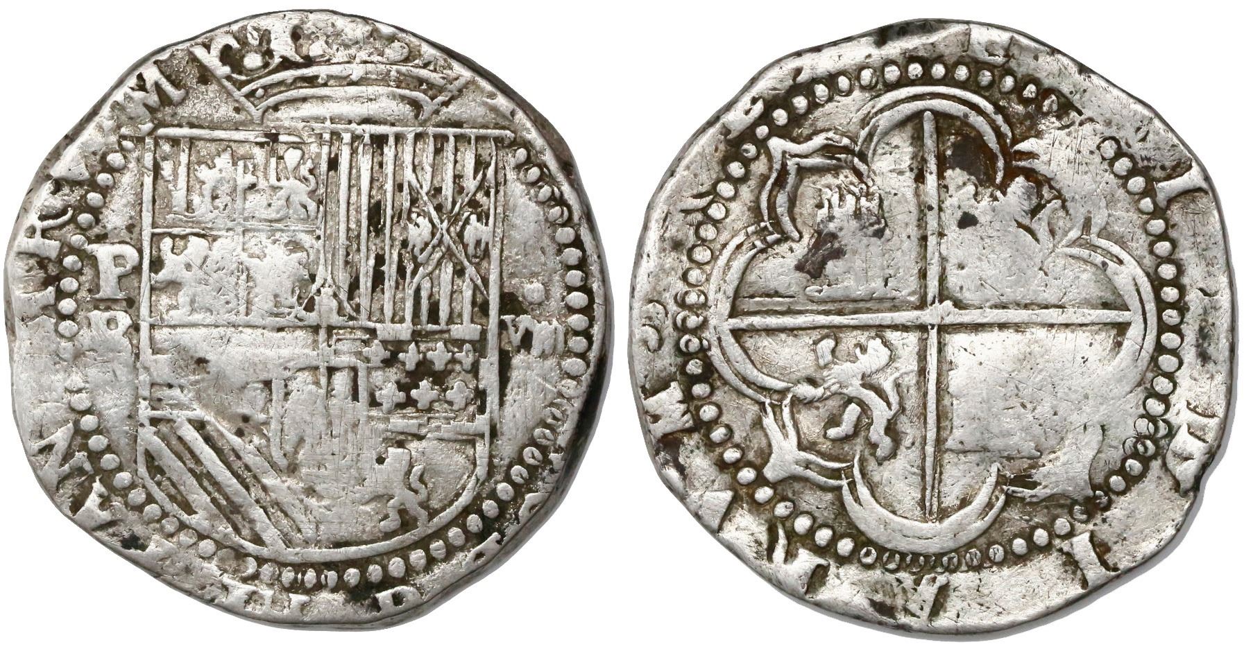Potosi, Bolivia, cob 8 reales, Philip II, assayer B (2nd period). S-P6; KM-5.1. 27.11 grams. Full shield and cross despite weak areas, Fine+ overall, with anomalous small crown above shield and old "Seville" lions on reverse.