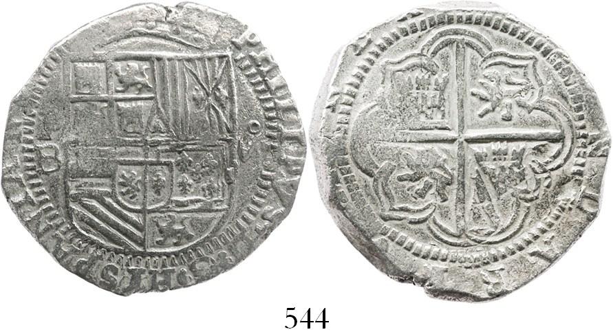 Potosi, Bolivia, cob 8 reales, Philip II, assayer B (3rd period), Grade-1 quality but Grade 2 on cer