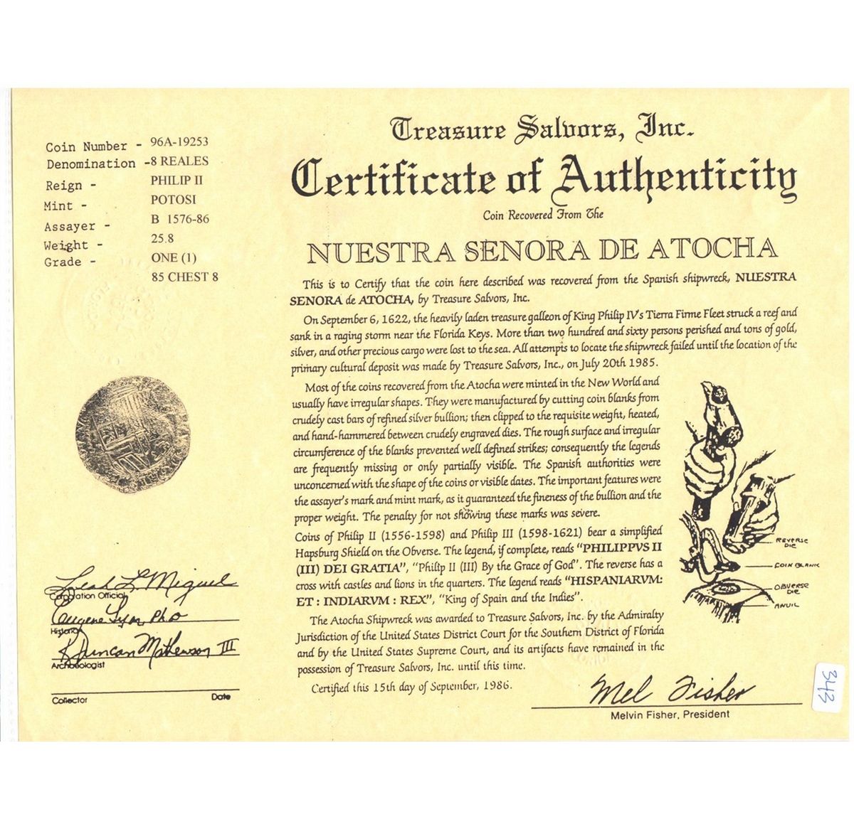 Potosi, Bolivia, cob 8 reales, Philip II, assayer B (3rd period), Grade 1. S-P10; KM-5.1. 25.8 grams. Thick and solid specimen with full and uncorroded cross, excellent full shield, nearly full legends, very silvery and with light corrosion near edge only. With Fisher certificate #96A-19253. Recovered from: Atocha, sunk in 1622 west of Key West, Florida