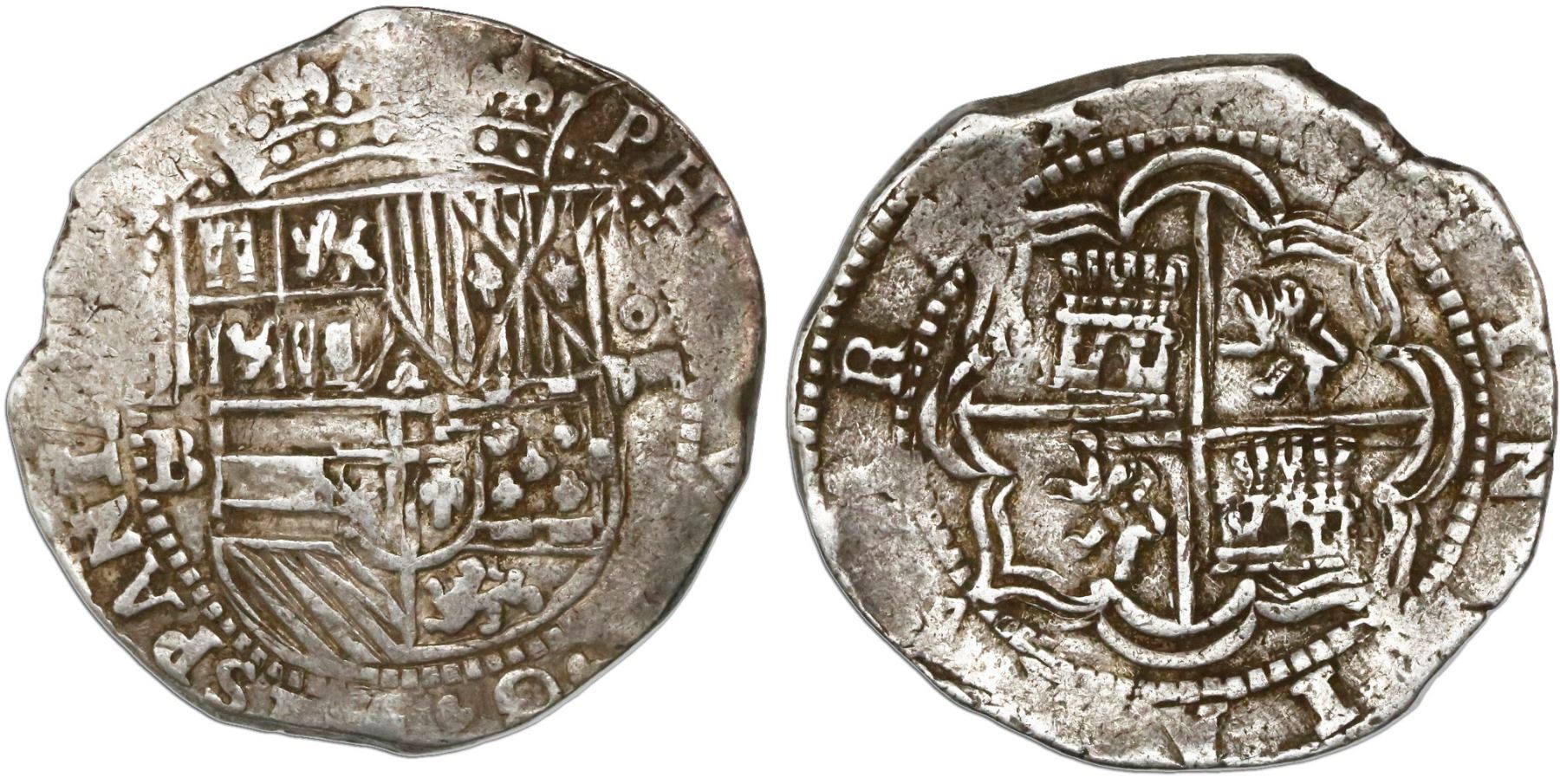 Potosi, Bolivia, cob 8 reales, Philip II, assayer B (3rd period, late style).