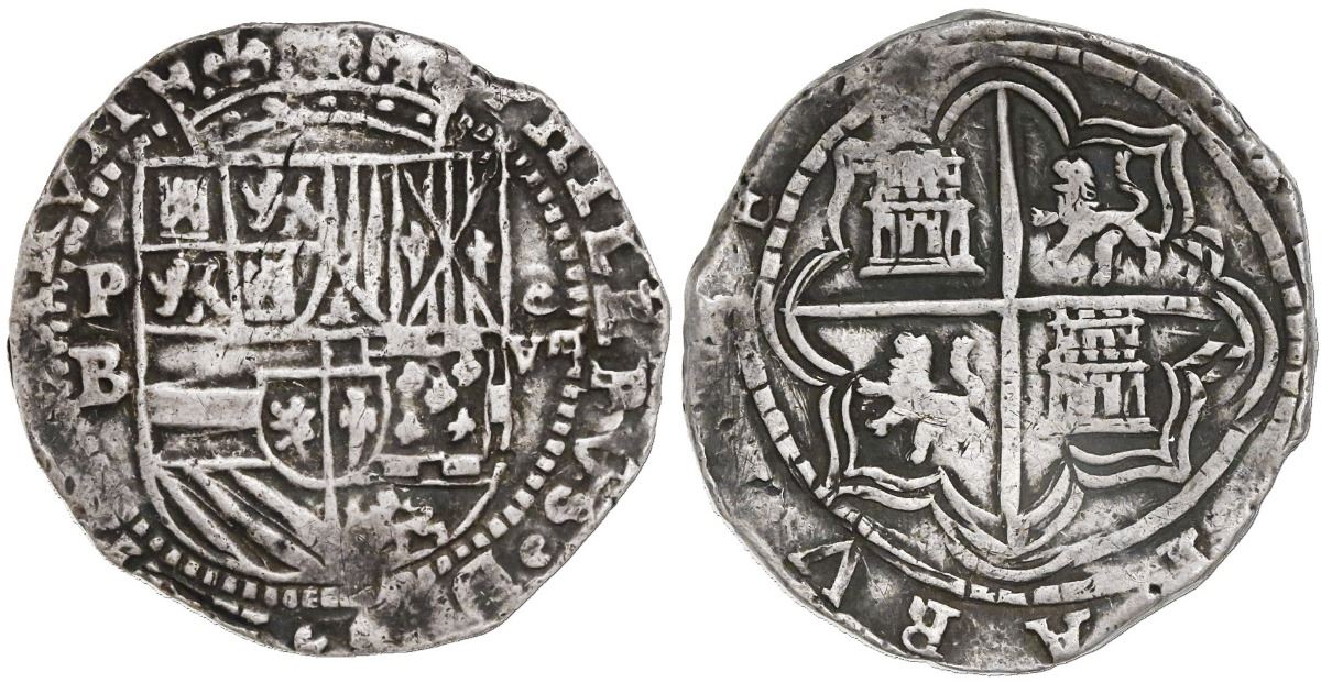 Potosi, Bolivia, cob 8 reales, Philip II, assayer B (3rd period, late variety).