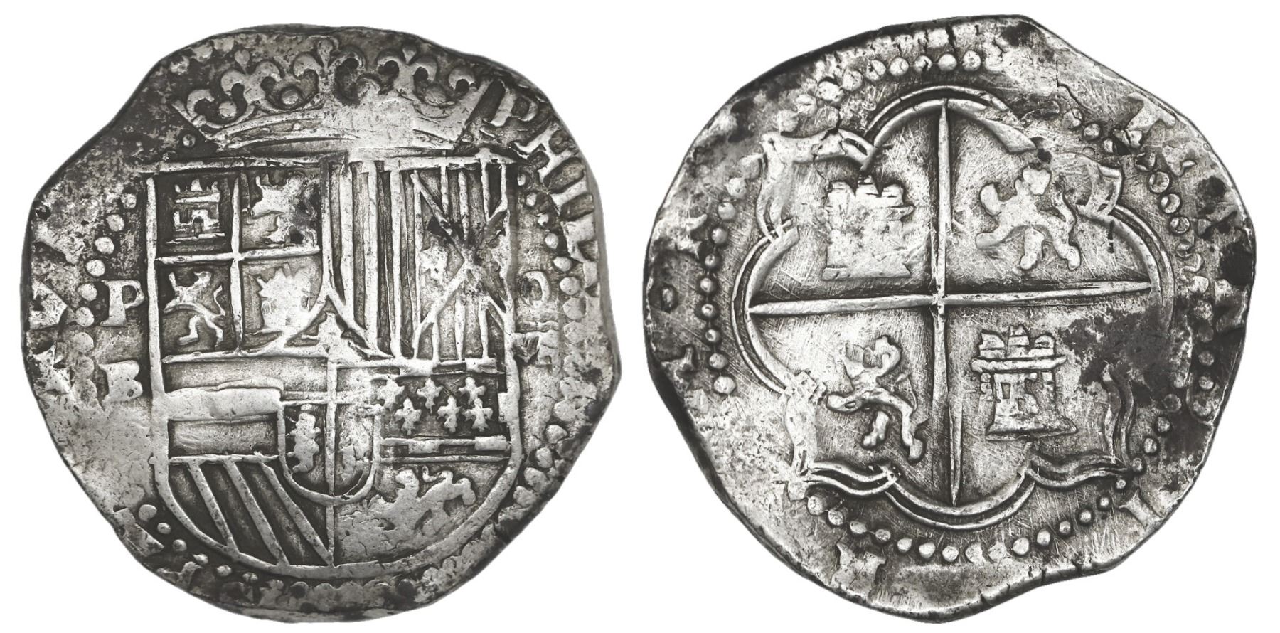 Potosi, Bolivia, cob 8 reales, Philip II, assayer B (3rd period), tiny-B variety.