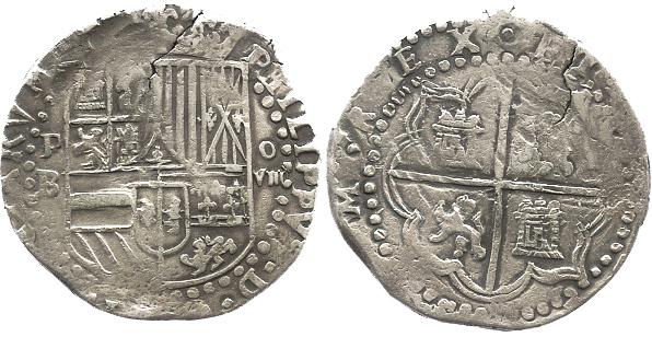 Potosi, Bolivia, cob 8 reales, Philip II, assayer B (3rd period).