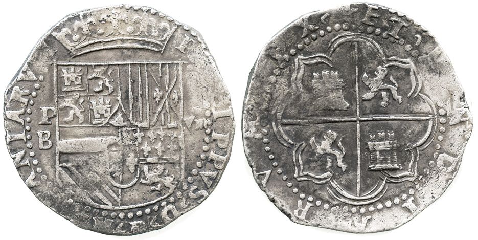 Potosi, Bolivia, cob 8 reales, Philip II, assayer B (3rd period).