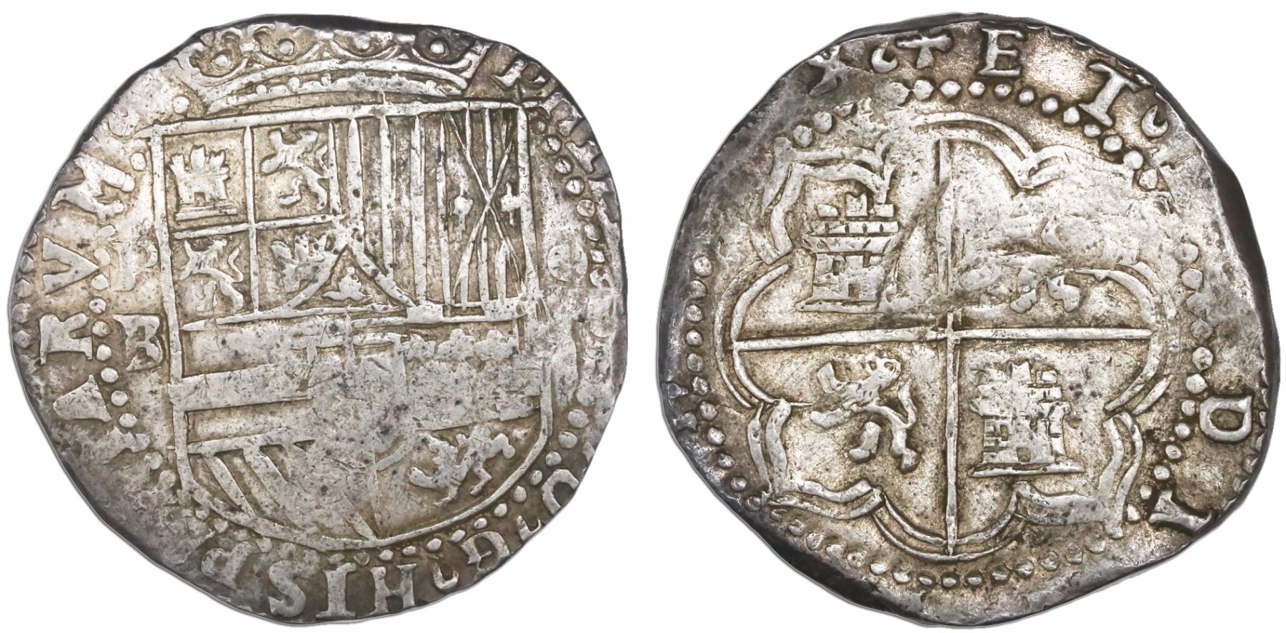 Potosi, Bolivia, cob 8 reales, Philip II, assayer B (3rd period).