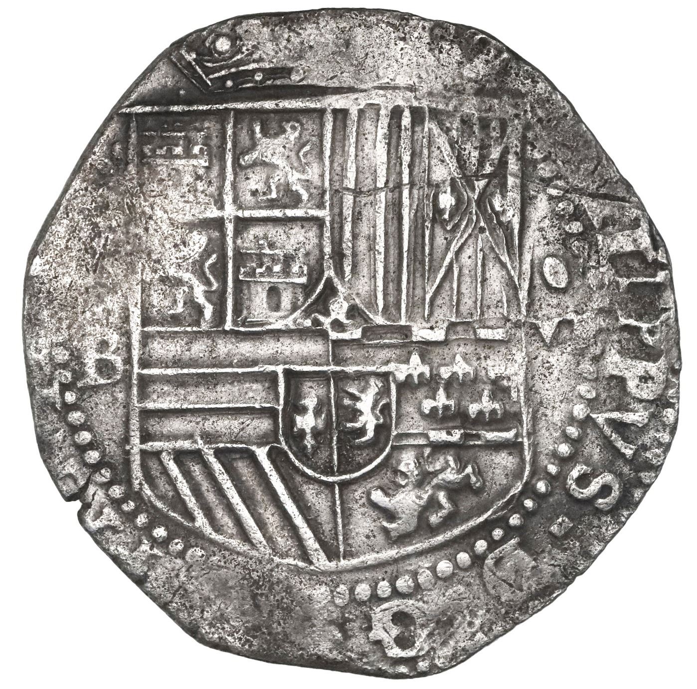 Potosi, Bolivia, cob 8 reales, Philip II, assayer B (3rd period). S-P10; KM-5.1; Cal-672. 26.89 grams. Well-detailed full shield and cross-and-tressure, some bold legend, AU with light surface porosity, toned in crevices.